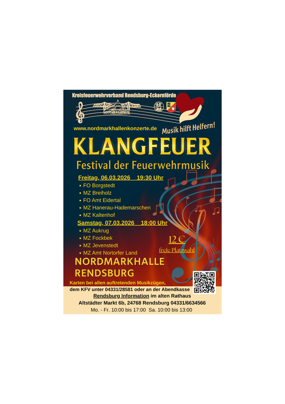 Wir freuen uns auf euch! Die beliebten Konzerte der Feuerwehrmusik in der Nordmarkhalle haben einen neuen Namen: Klangfeuer! Wer uns kennt, weiß, wie vielfältig und unterhaltsam die Abende sind, so wie die MusikerInnen, die sie gestalten. Und der Benefizzweck ist natürlich auch weiterhin dabei! Der Reinerlös des Klangfeuers geht an Feuerwehrkameradinnen und Kameraden und deren Familien, die in Not geraten sind. Allein im Jahr 2025 konnten wir 3 Familien mit insgesamt 9.000 Euro unterstützen :-).